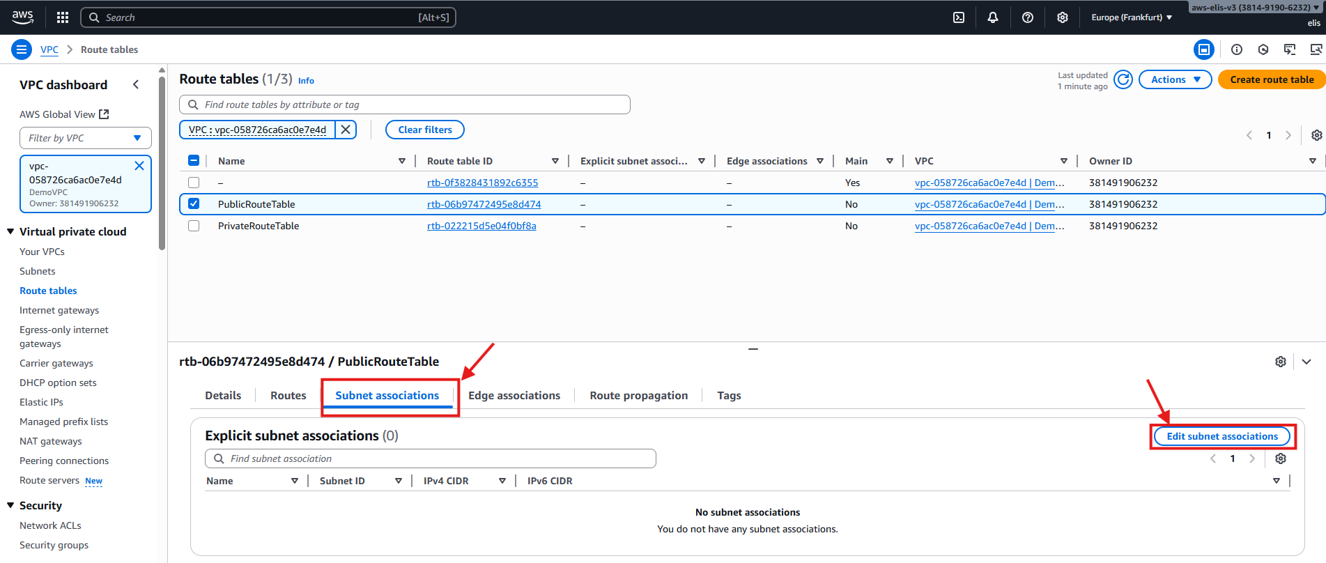 - Select DemoVPC and Public Subnet A
