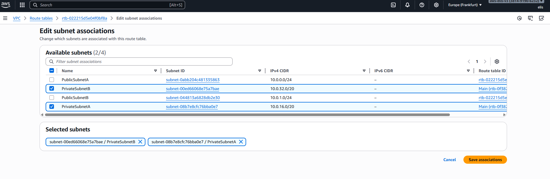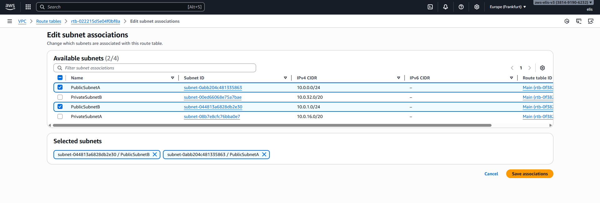 Now, letโs add subnet associations for our public route table, including Public Subnet A and Public Subnet B.