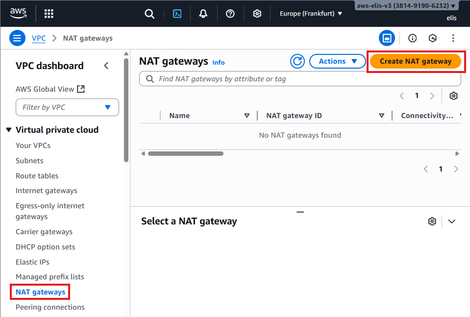Go to VPC โ NAT Gateways โ Create NAT Gateway: