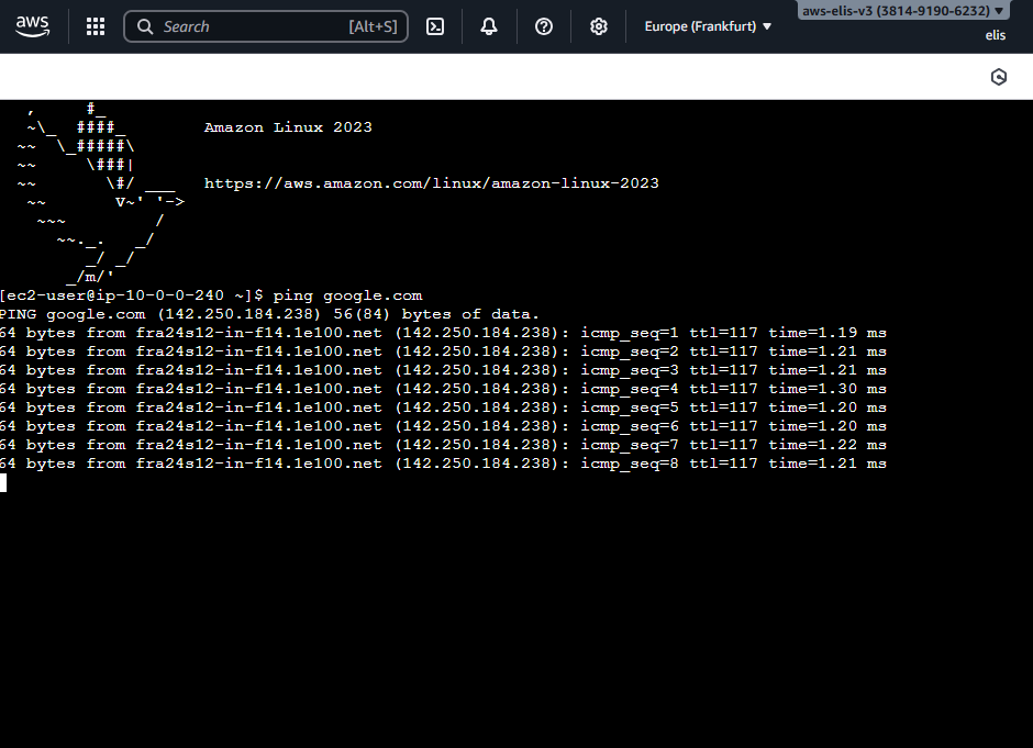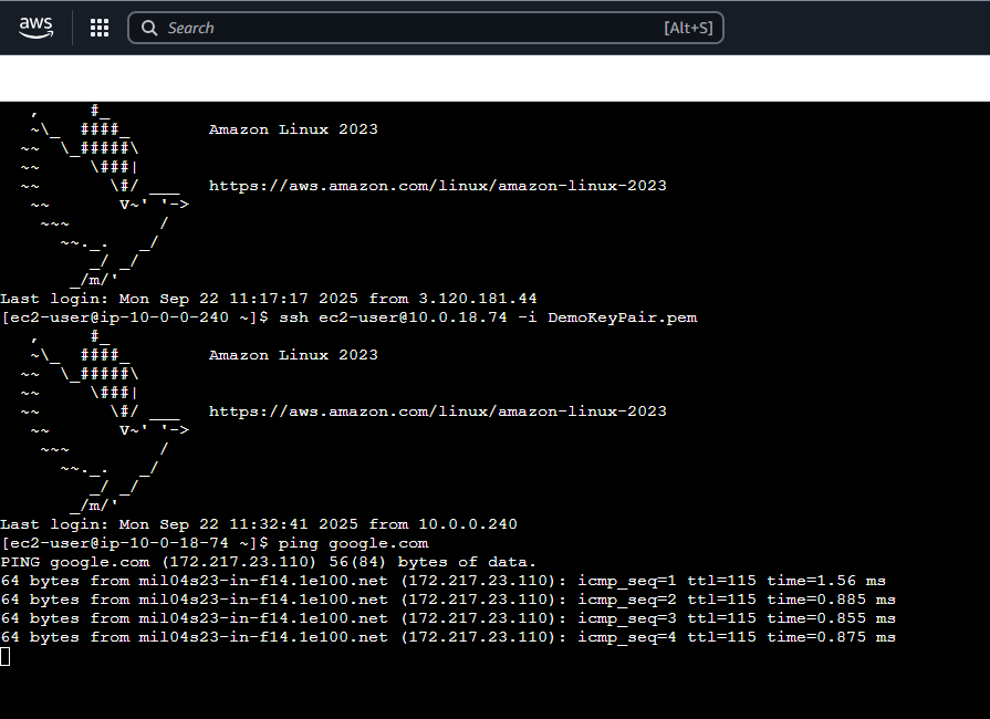 At this point, pinging external websites will fail until we set up NAT Gateway.