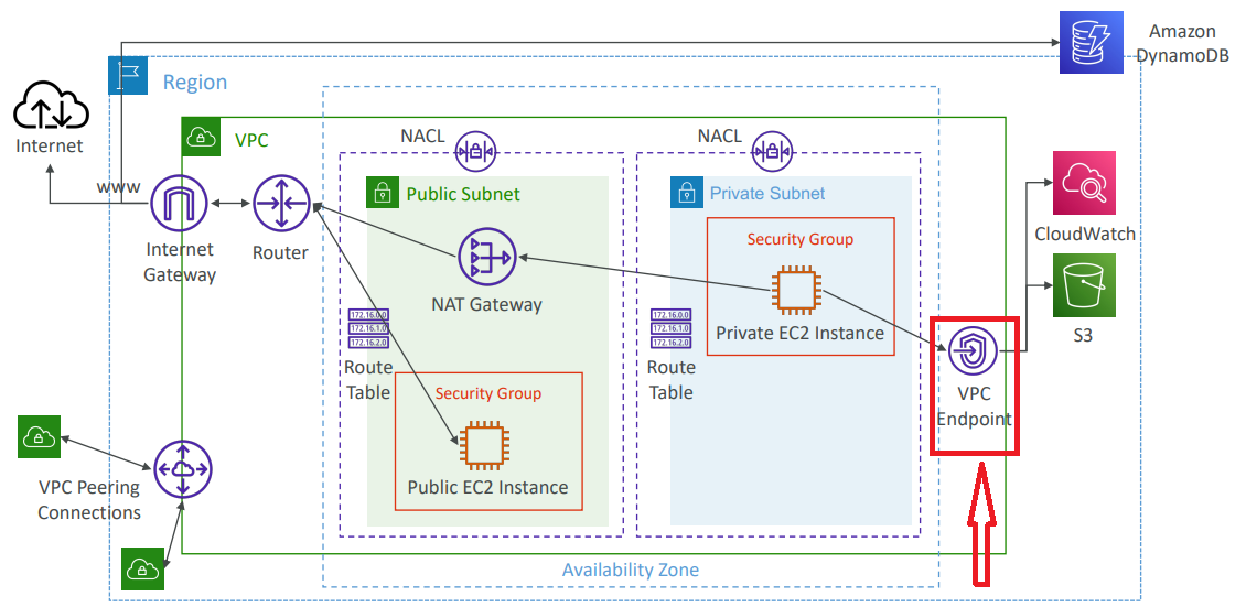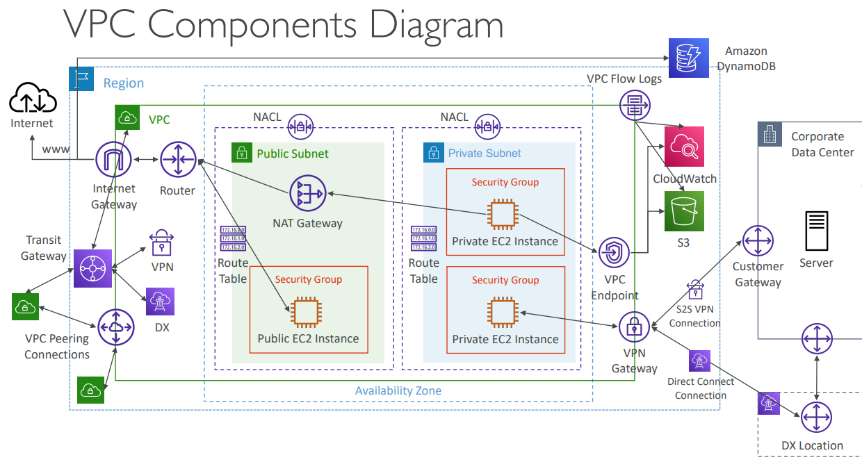 This diagram shows how all VPC components connect: Internet Gateway, NAT Gateway, Route Tables, Public/Private Subnets, EC2 Instances, VPC Peering, Endpoints, and Flow Logs.