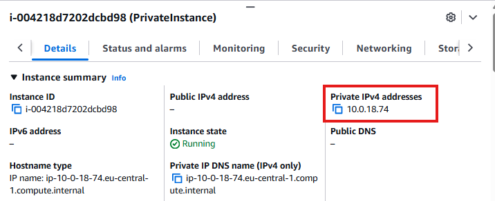 - Check Private IPv4 address of the private instance: