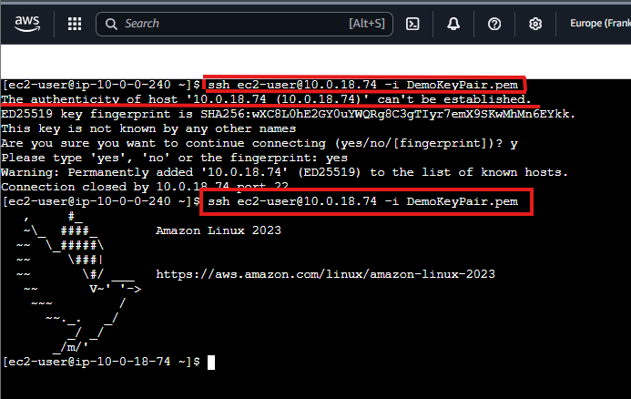 ssh -i "DemoKeyPair.pem" ec2-user@10.0.18.74