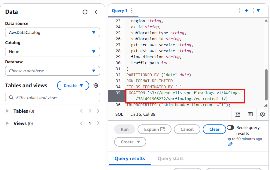- Copy the DDL statement from AWS documentation: https://docs.aws.amazon.com/athena/latest/ug/vpc-flow-logs-create-table-statement.html