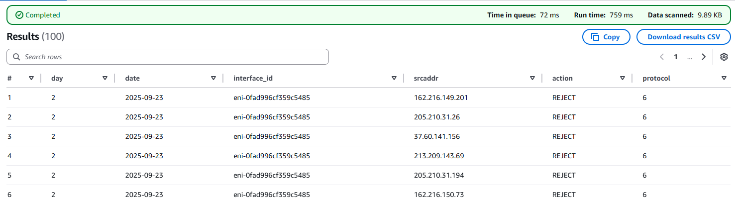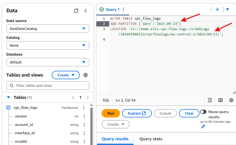 - After running this, Athena can query the Flow Logs for the specified date.
