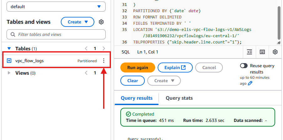- This creates a table linked to your S3 Flow Logs.