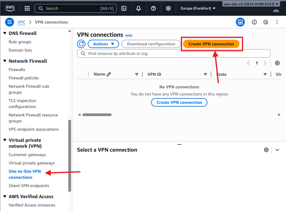 - Navigate to VPC โ VPN Connections โ Create VPN Connection.