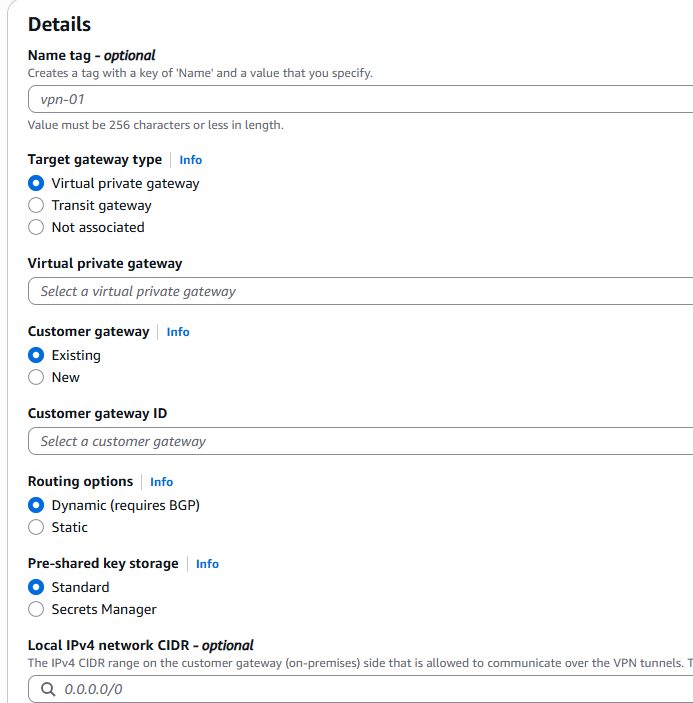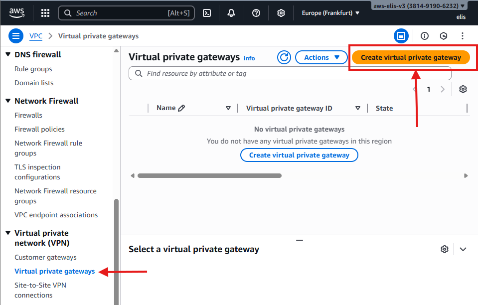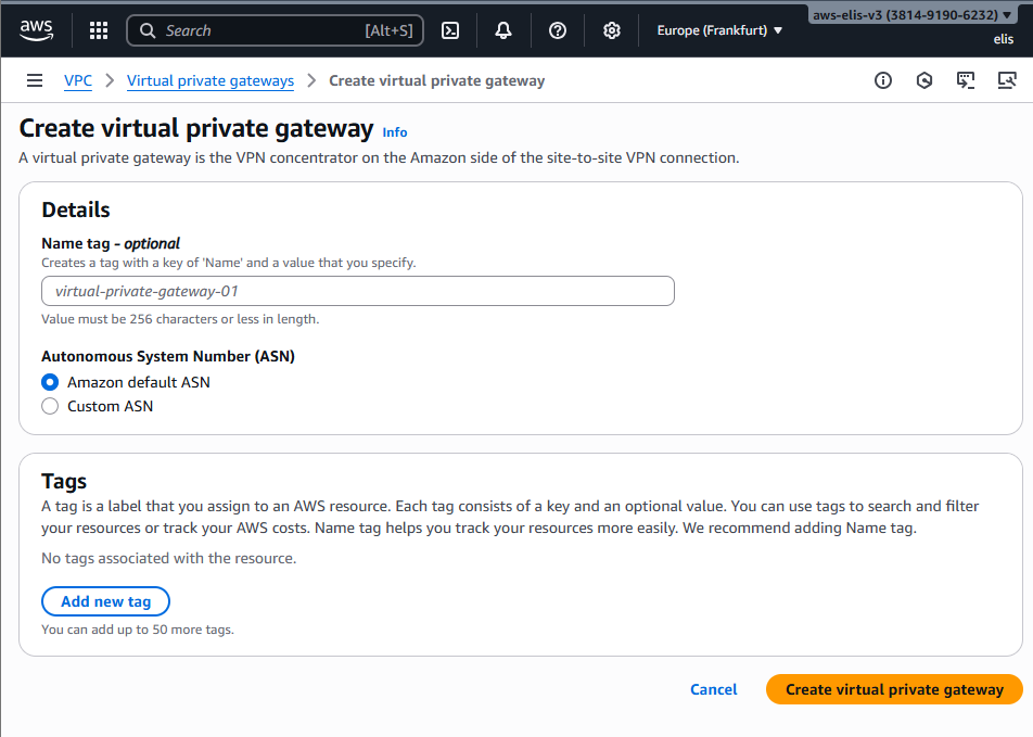 - Navigate to VPC โ Virtual Private Gateways โ Create Virtual Private Gateway.